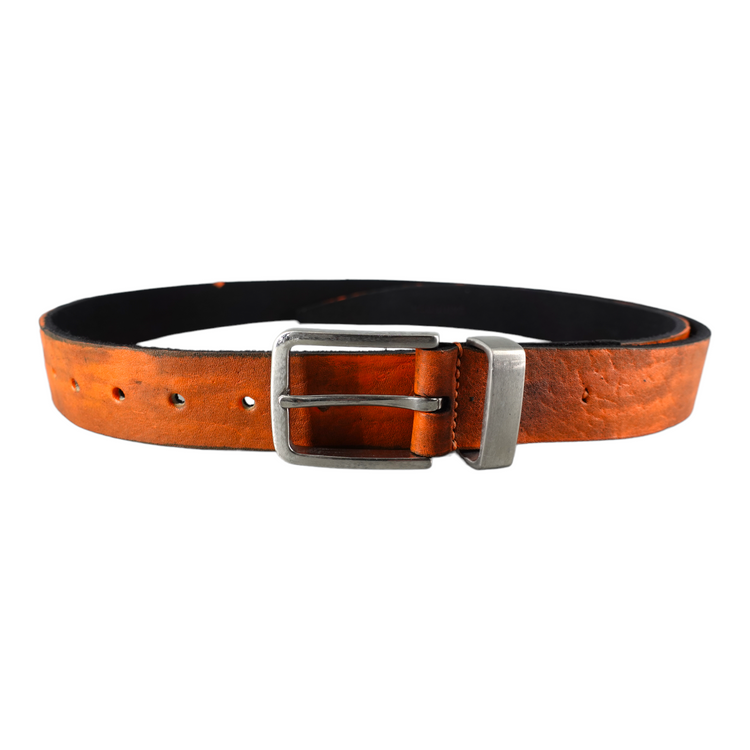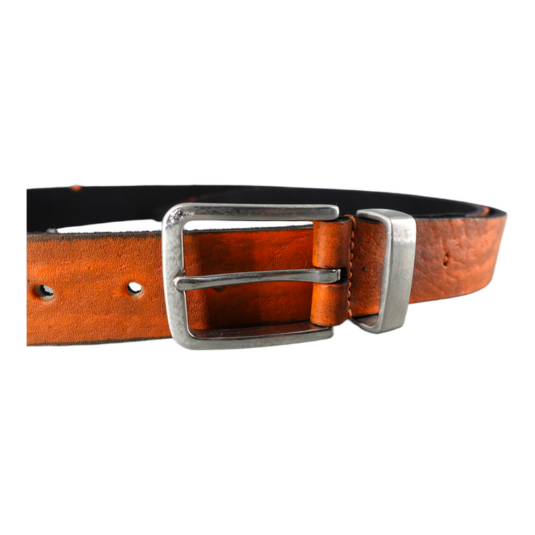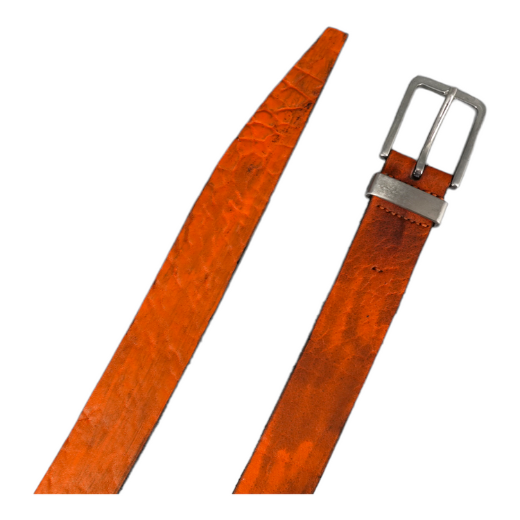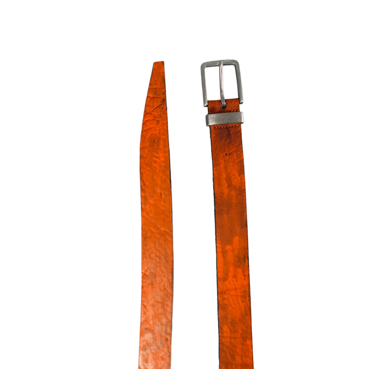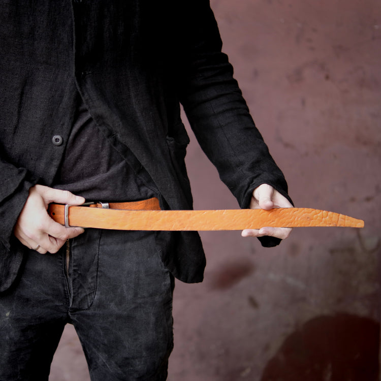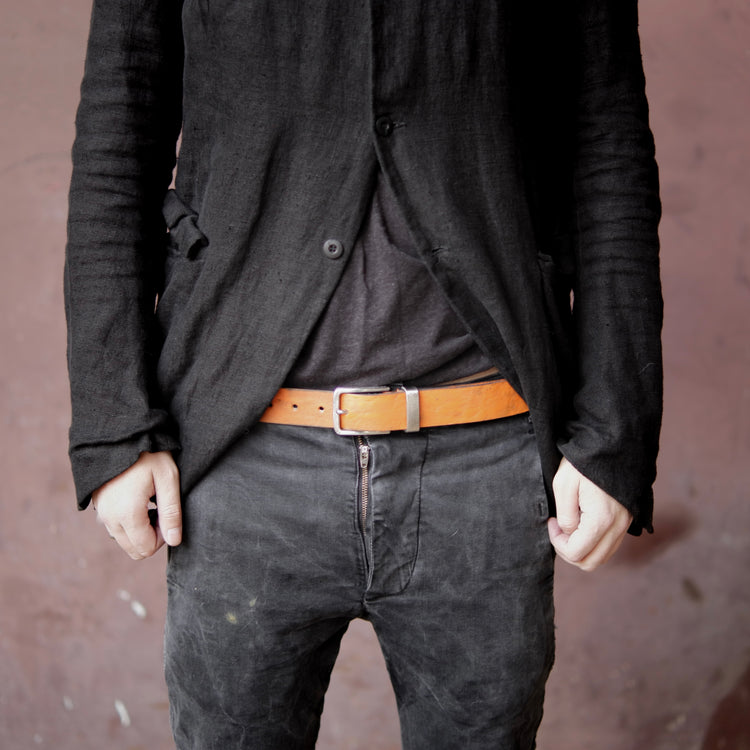 This beautiful belt with incredible structure is made from German buffalo. The leather is first split to desired thickness and then dyed by hand. The buckle as well as the loop are made from solid stainless steel which is then aged by hand.