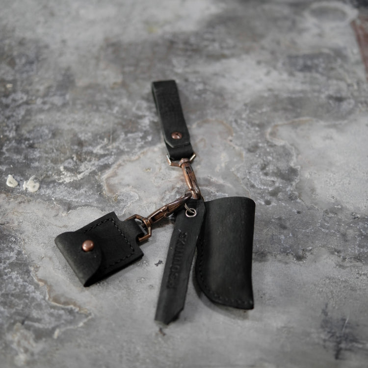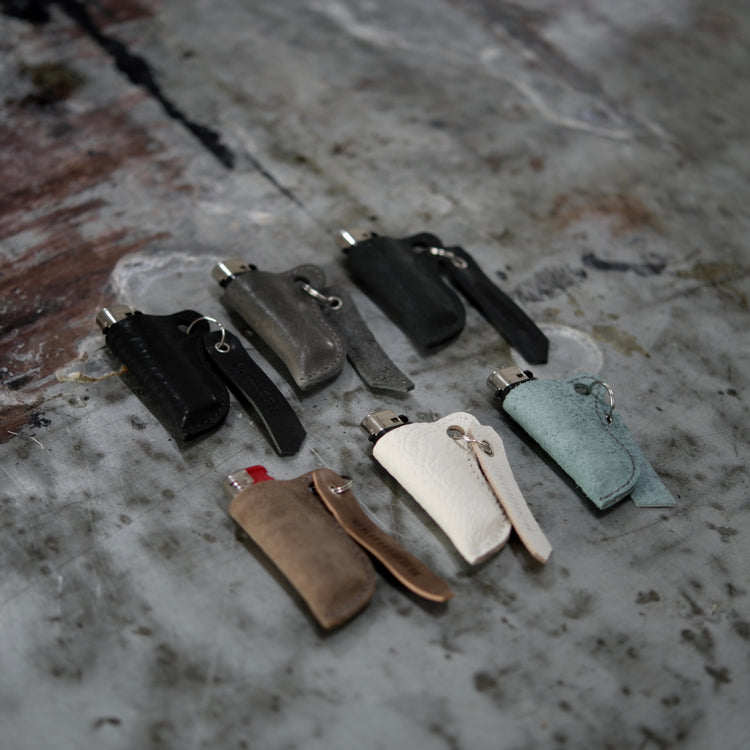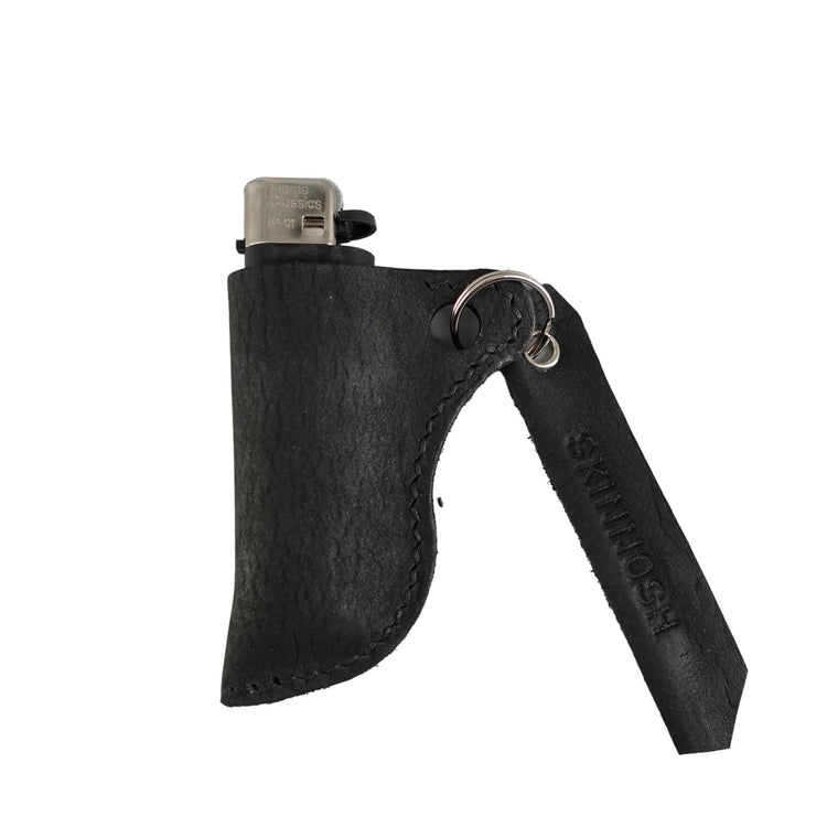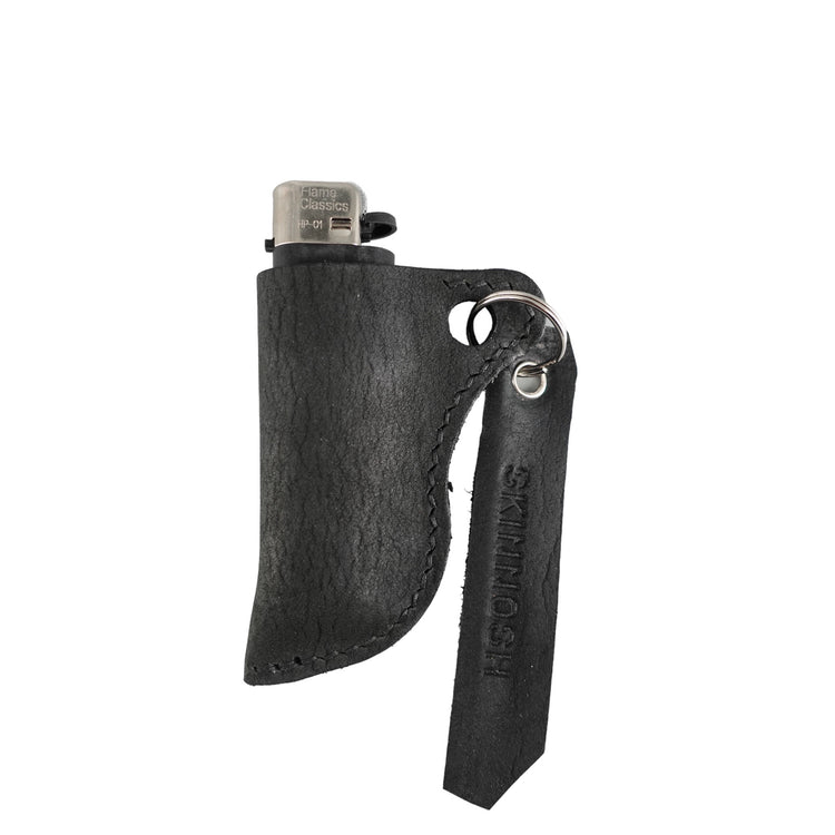 The Lighter Case fits a standard BIC lighter perfectly. It has a small metal ring which can be used to attach it to keychain and other accessories. This iteration is made from black soft horse leather. The extra leather strip with SKINNOSH logo can be detached.