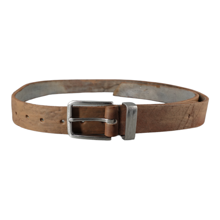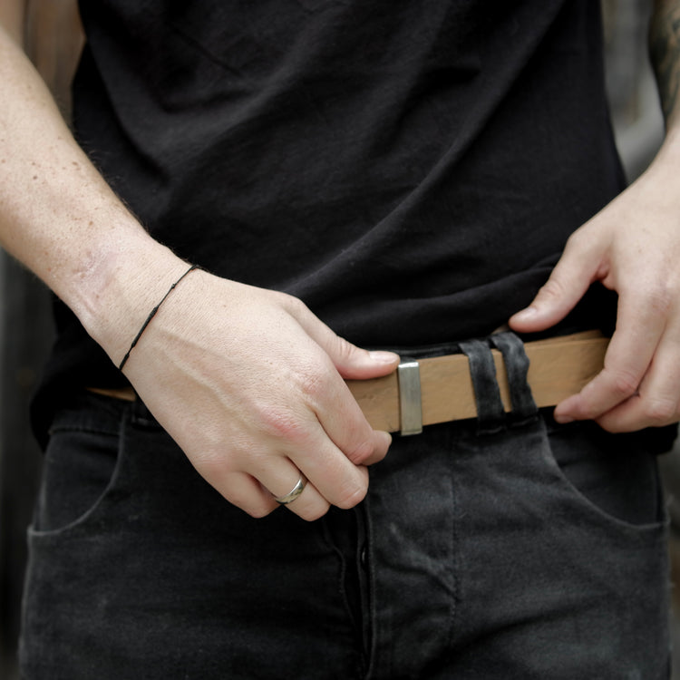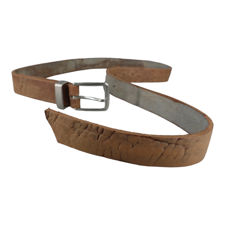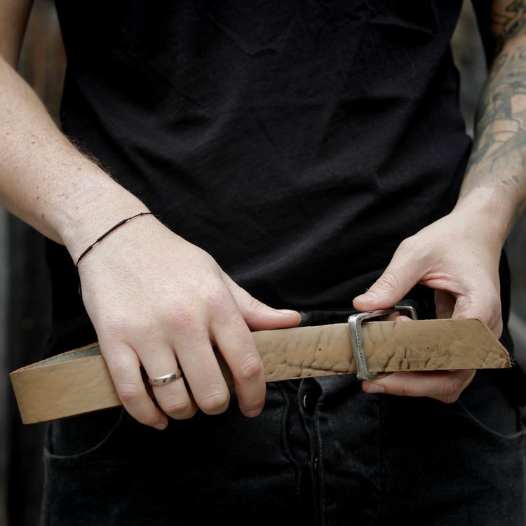 This beautiful belt with incredible structure is made from German buffalo. The leather is first split to desired thickness and then dyed by hand. The buckle as well as the loop are made from solid stainless steel which is then aged by hand.