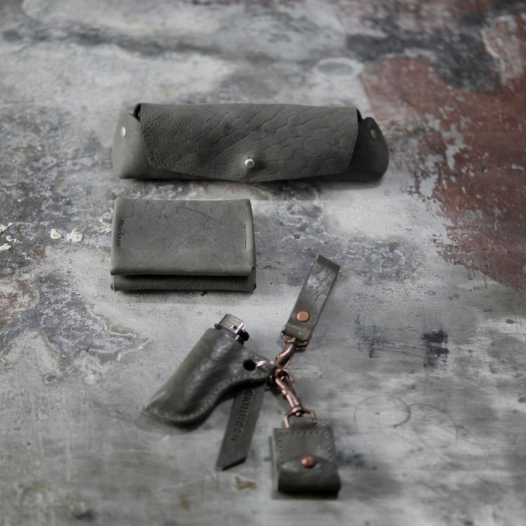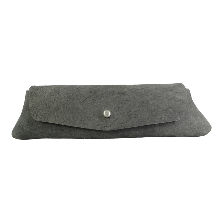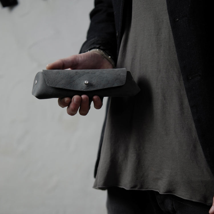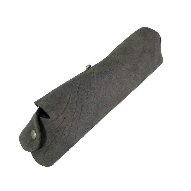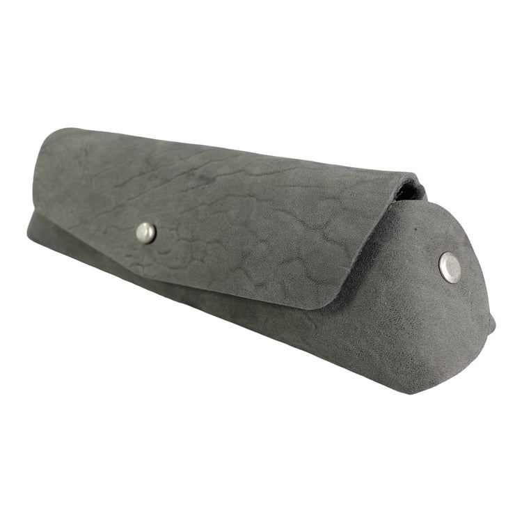 This case is made from one piece of leather and can carry your (sun) glasses, pencils, etc. It has 2 rivets on the sides as well as a button for closure. This iteration comes in grey Culatta (horse butt) which provides beautiful natural scarring and feels amazing in-hand.