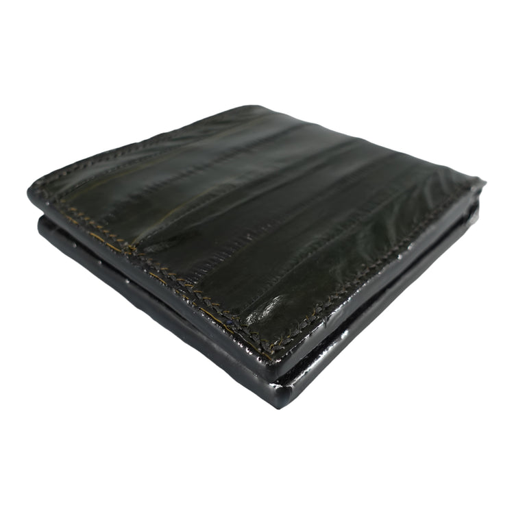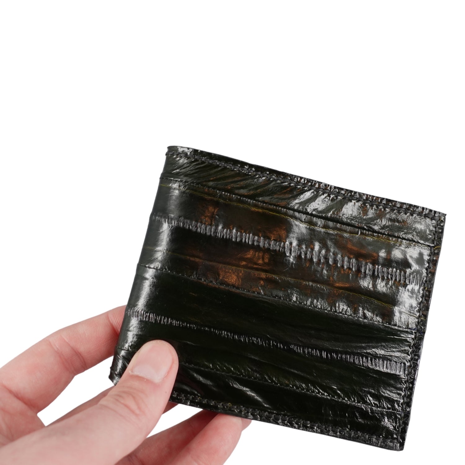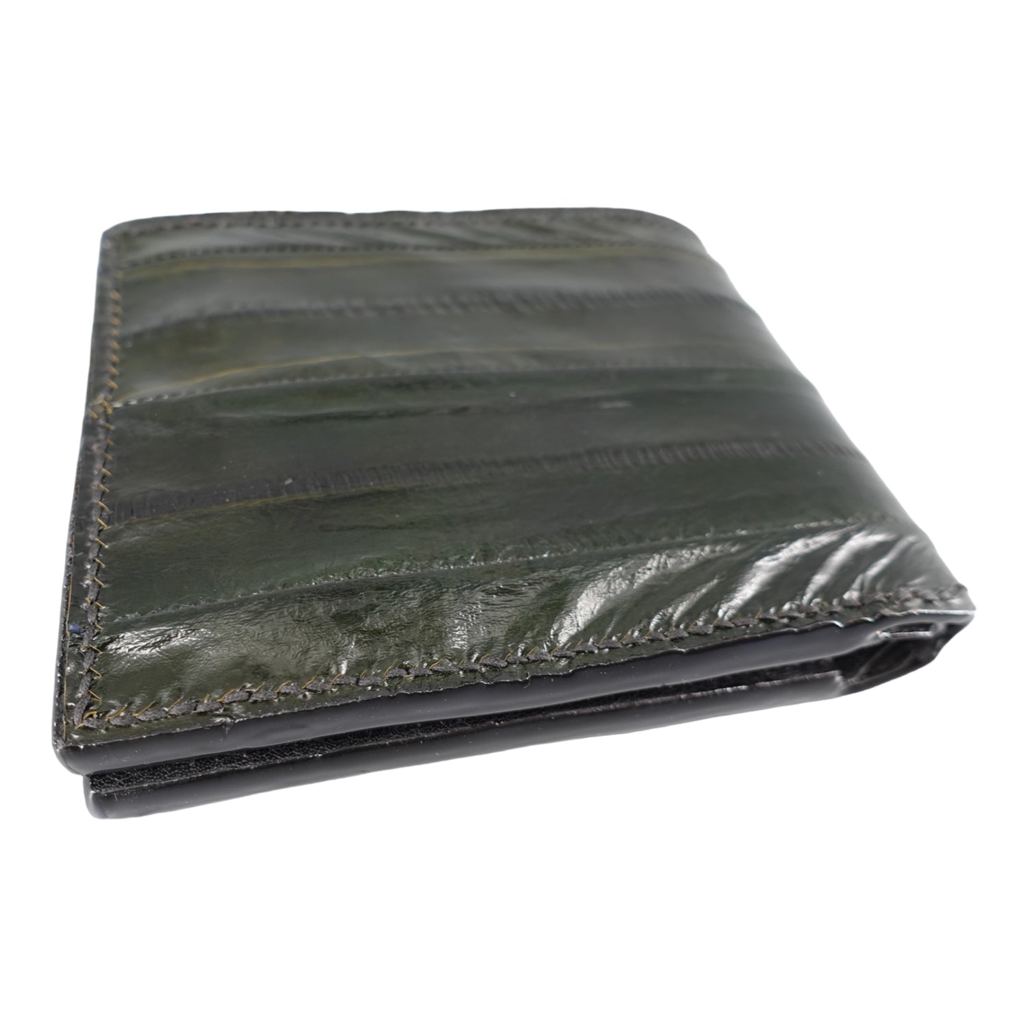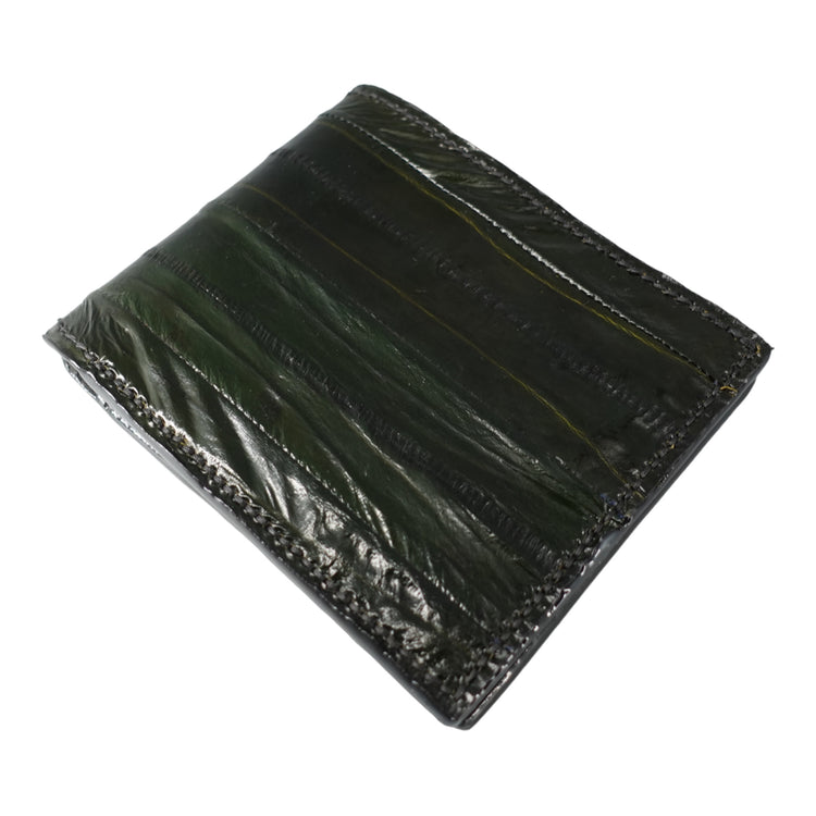 The Binary Wallet offers a lot of storage capacity, with 8 slots for credit cards, 2 hidden compartments, and 2 slots for bills and receipts. This iteration is made from forest green eel skin which provides a unique texture and feel.