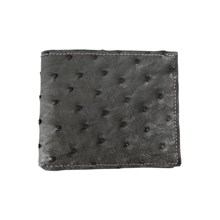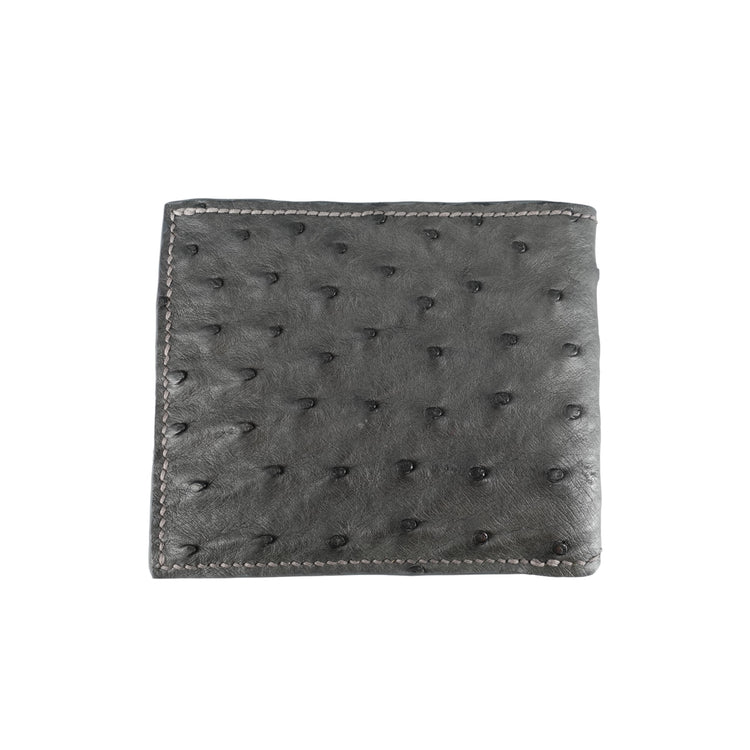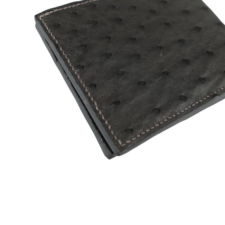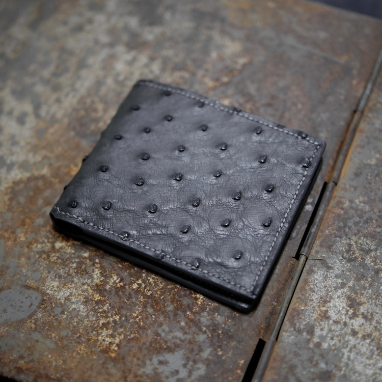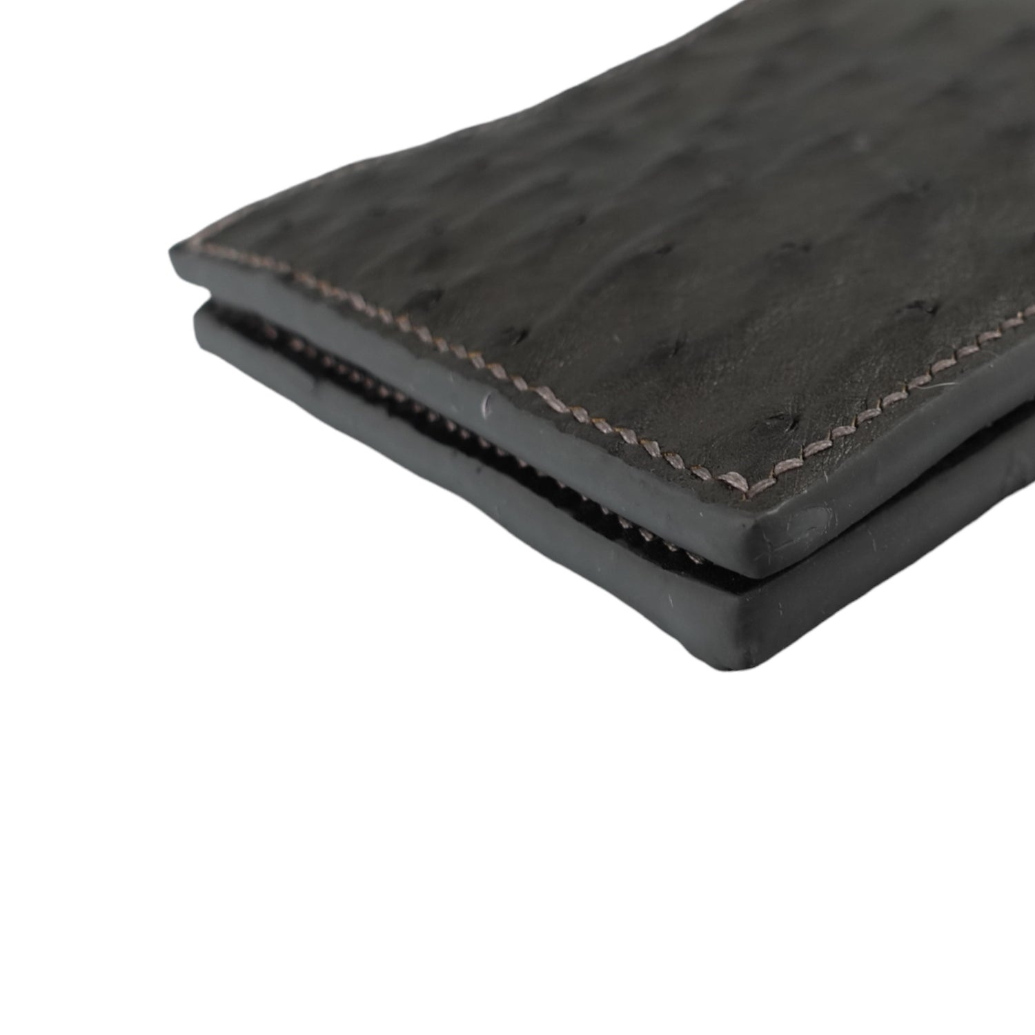 The Binary Wallet offers a lot of storage capacity, with 8 slots for credit cards, 2 hidden compartments, and 2 slots for bills and receipts. This iteration is made from grey genuine ostrich skin which provides a unique texture and feel.
