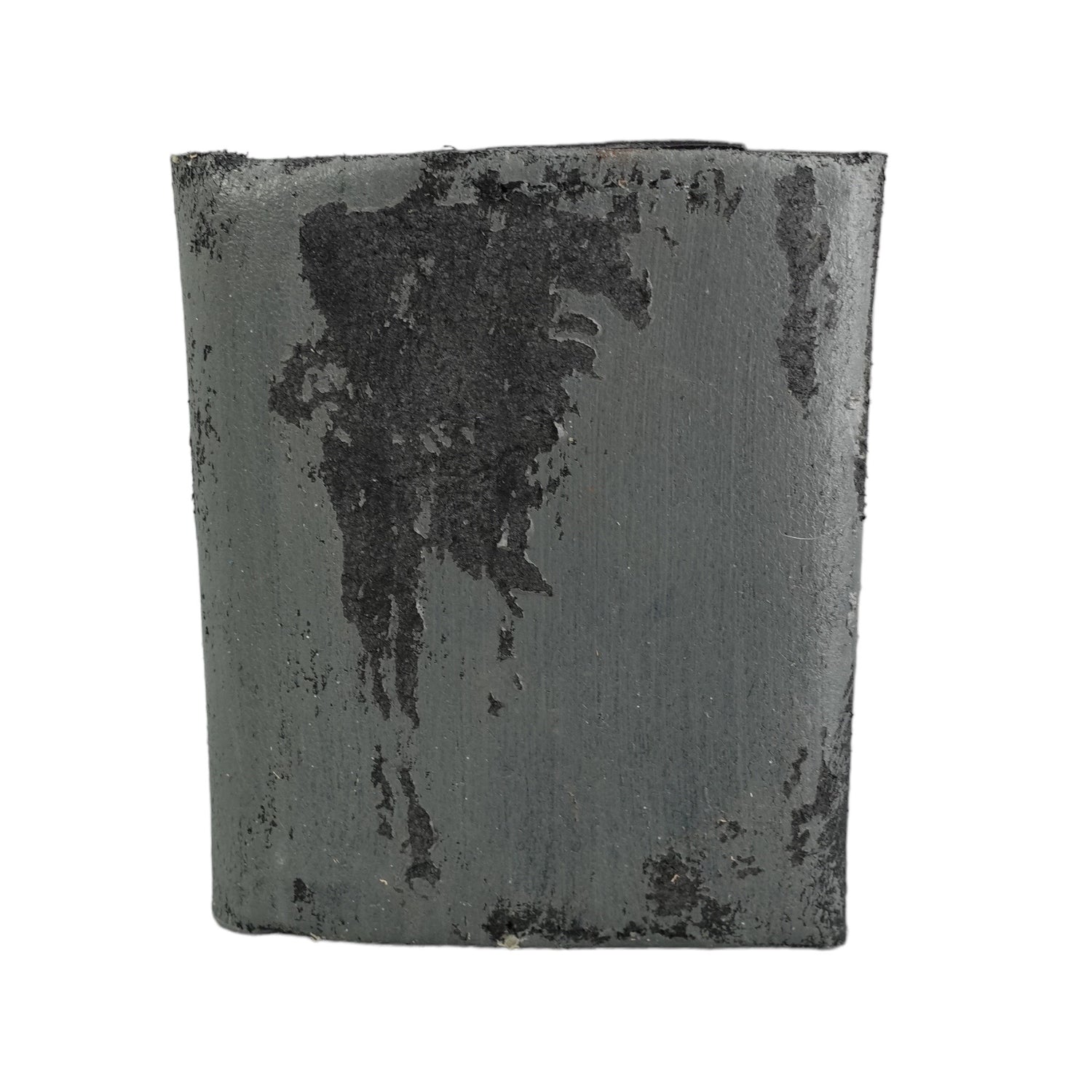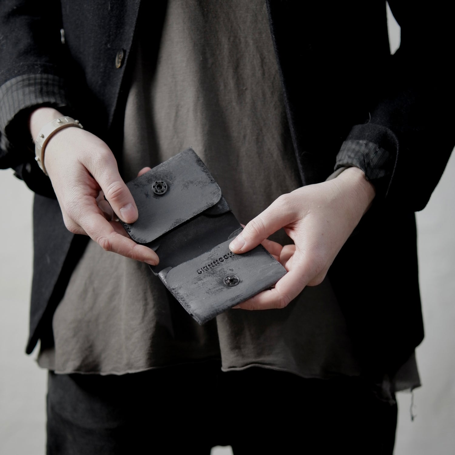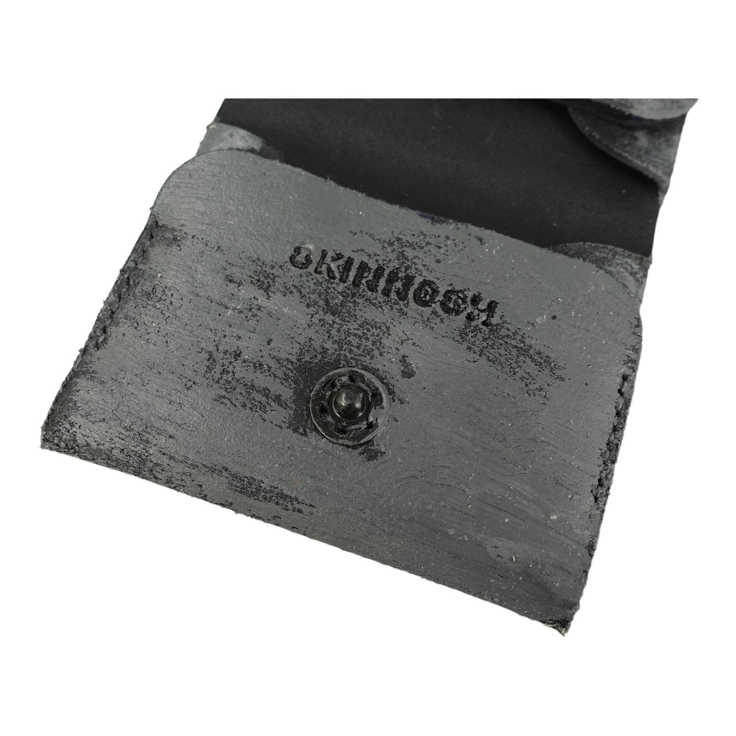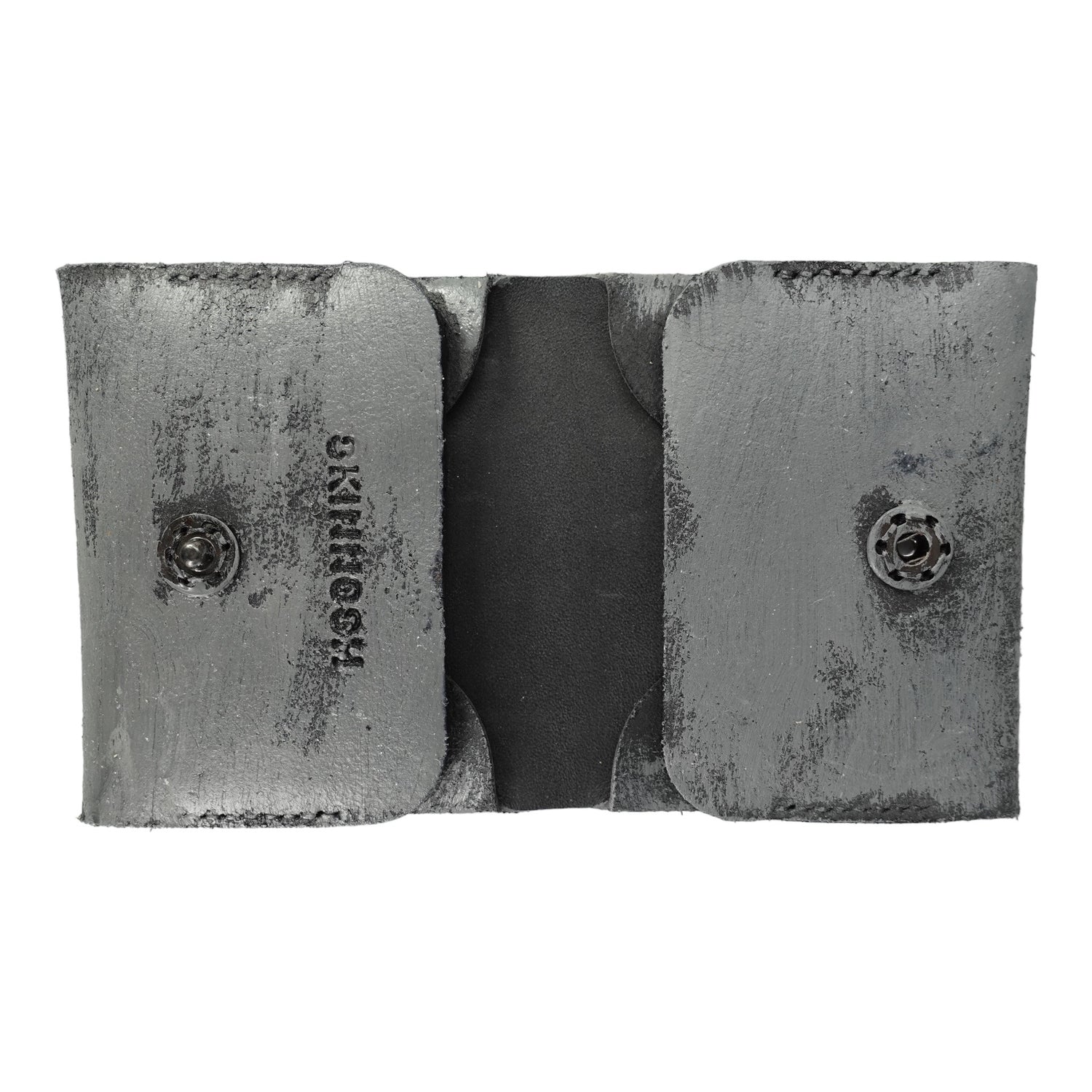 Folded wallet made out of German cowhide. It has 4 slots for cards and bills but can fit more cards. This Artist version is handpainted in grey. It features a sewn-on snap button to easily open and close it.