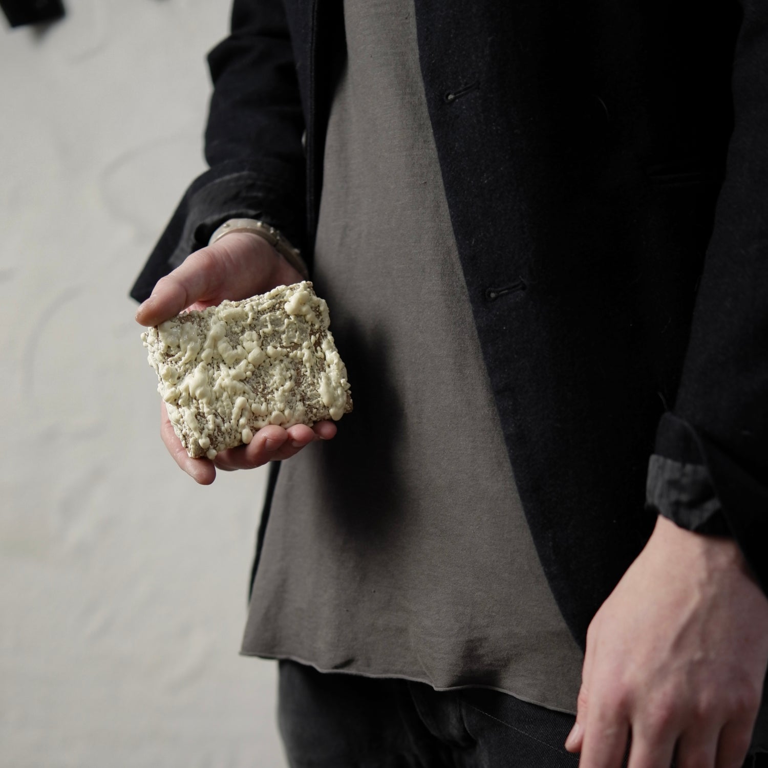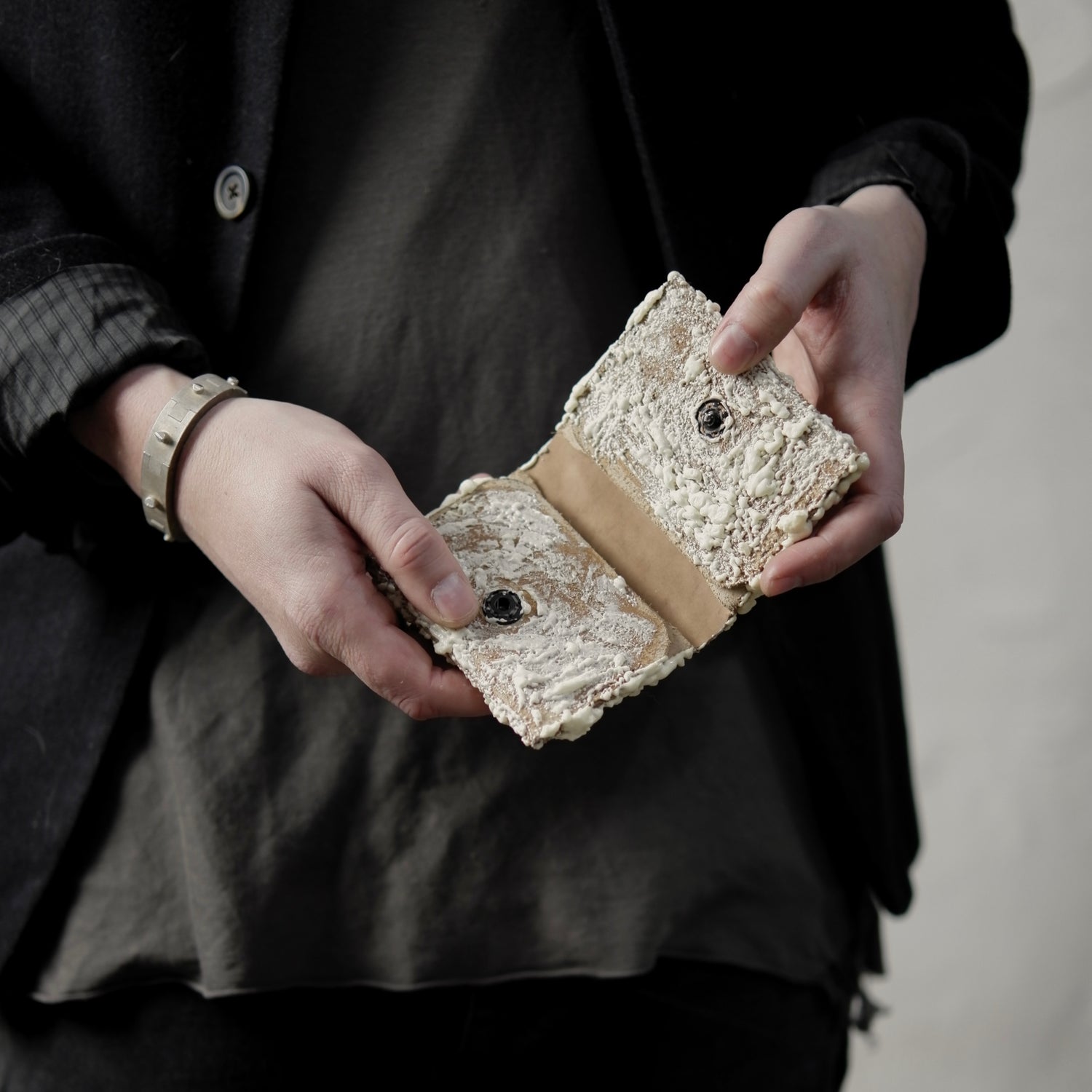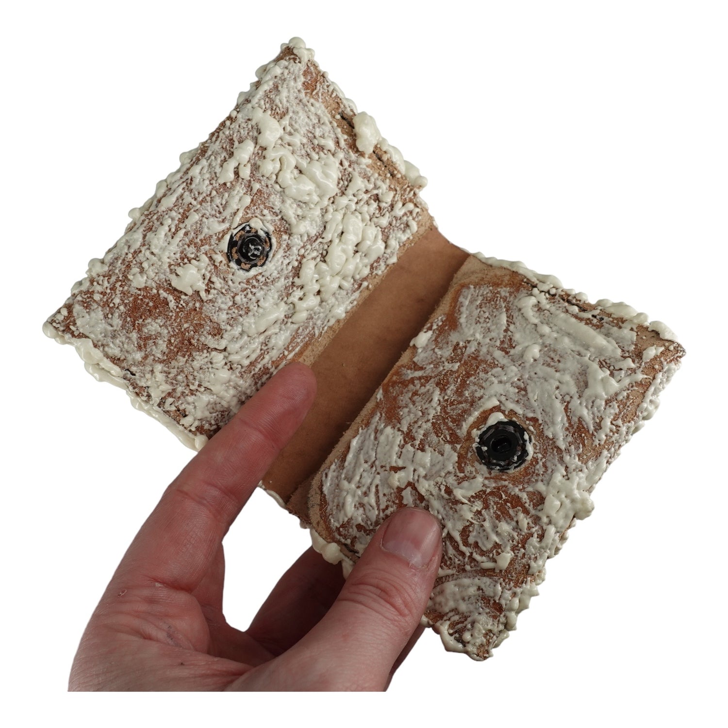 Folded wallet made out of German cowhide. It has 4 slots for cards and bills but can fit more cards. This Artist version is covered with foam which will yellow when exposed to sunlight. The foam is quite durable but it is not recommended to put the wallet in your back pocket and sit on it. It features a sewn-on snap button to easily open and close it.