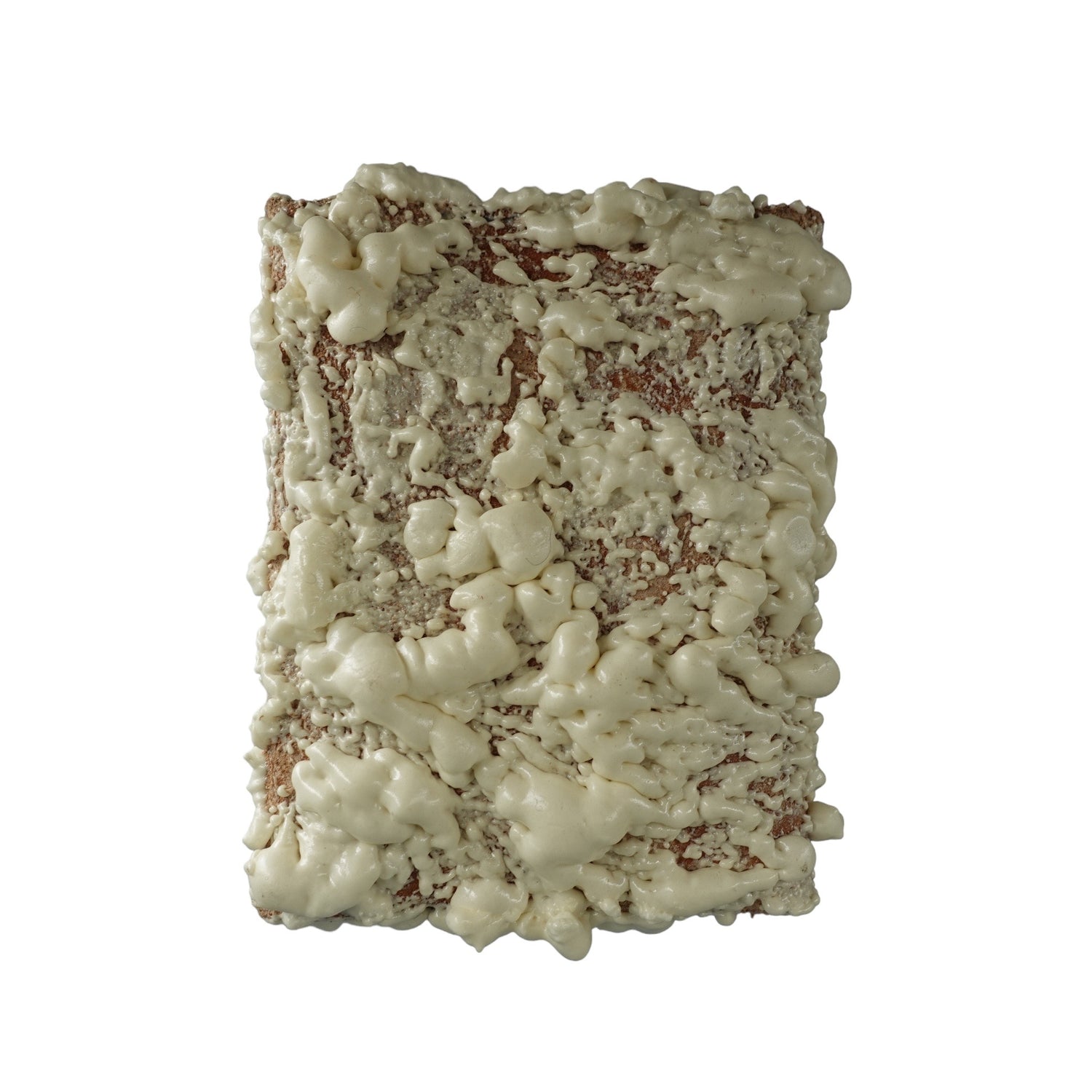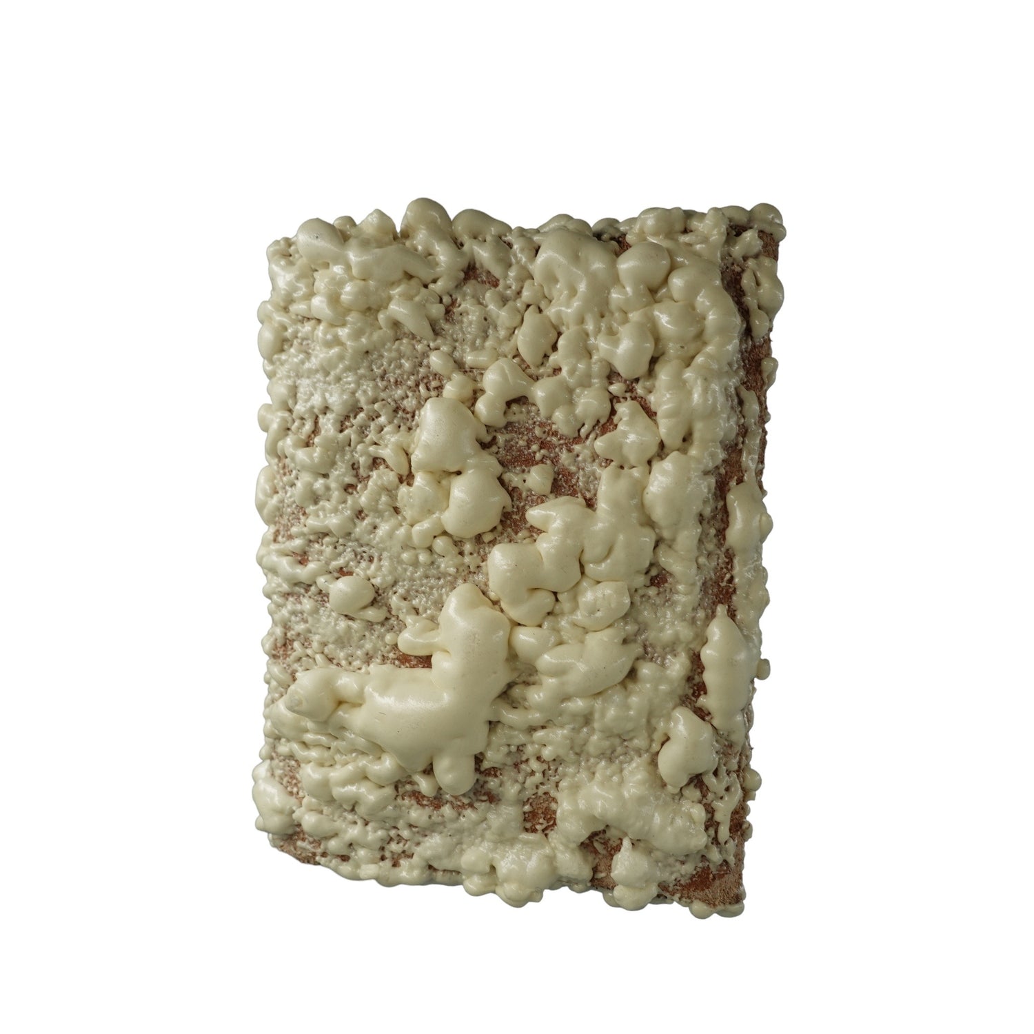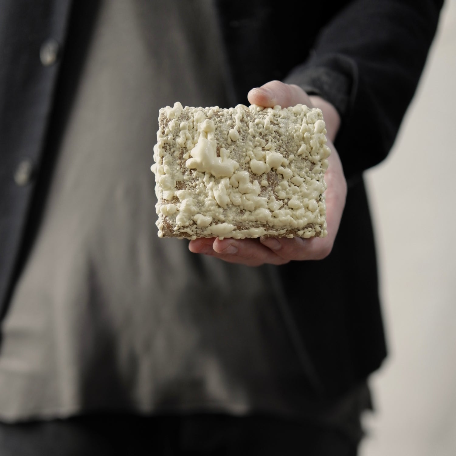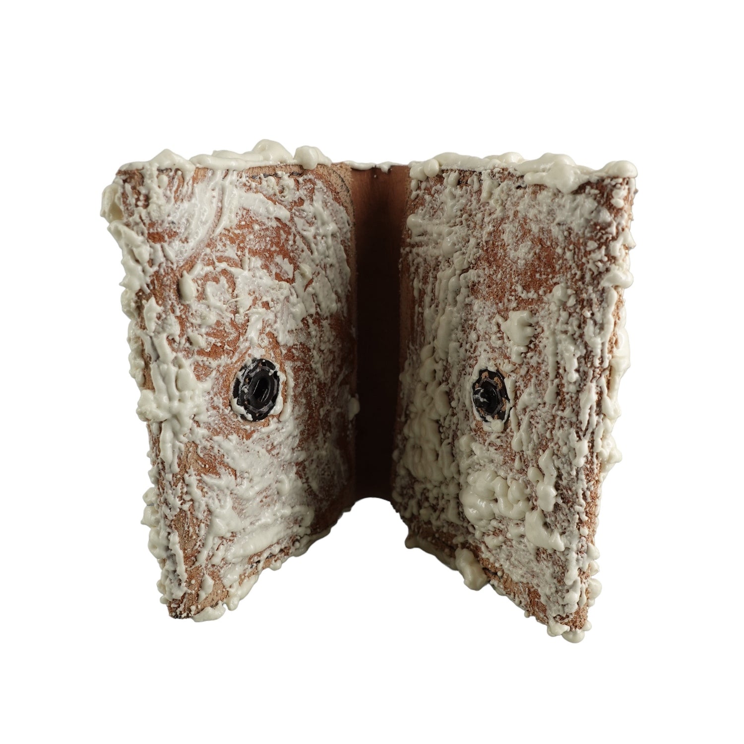 Folded wallet made out of German cowhide. It has 4 slots for cards and bills but can fit more cards. This Artist version is covered with foam which will yellow when exposed to sunlight. The foam is quite durable but it is not recommended to put the wallet in your back pocket and sit on it. It features a sewn-on snap button to easily open and close it.