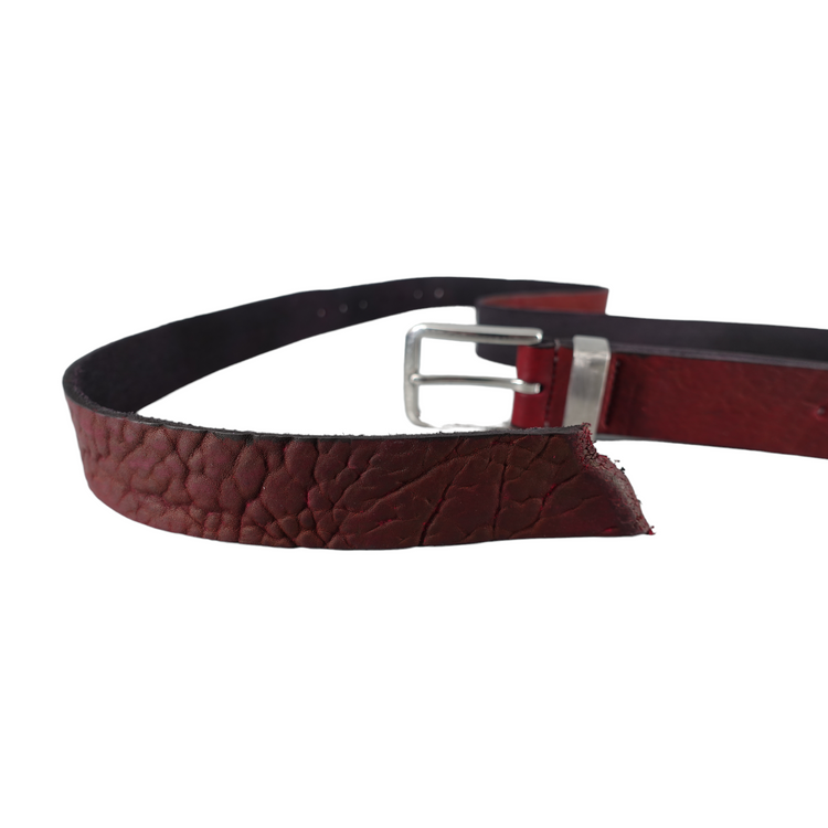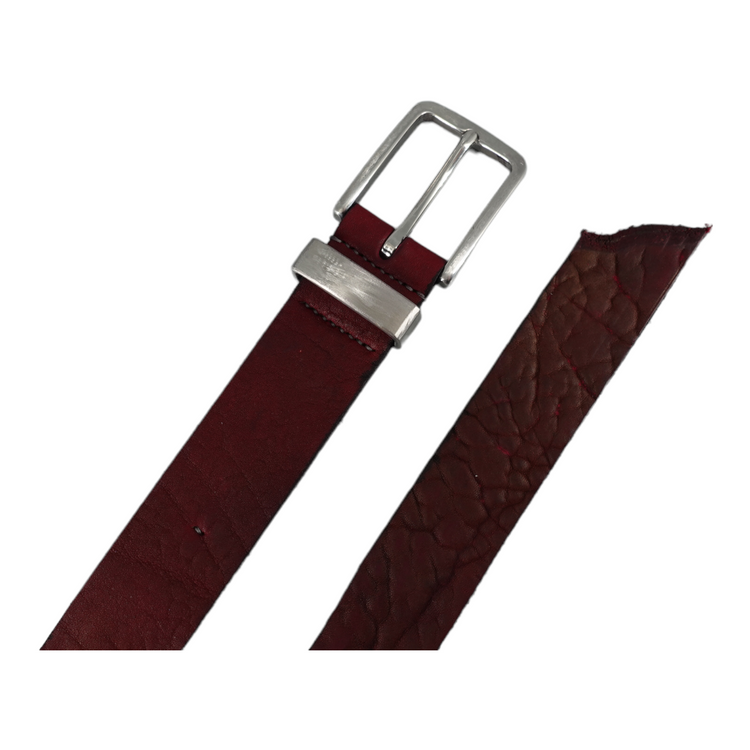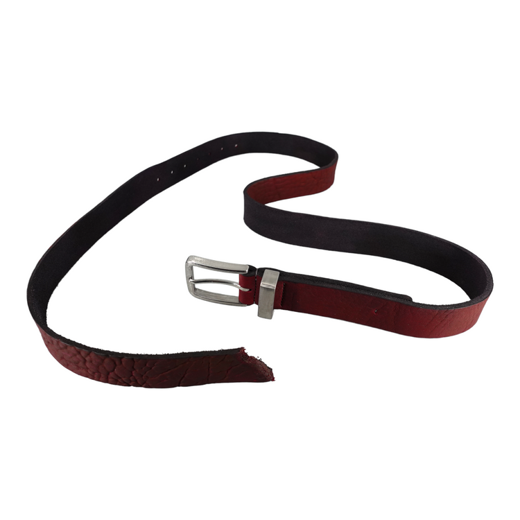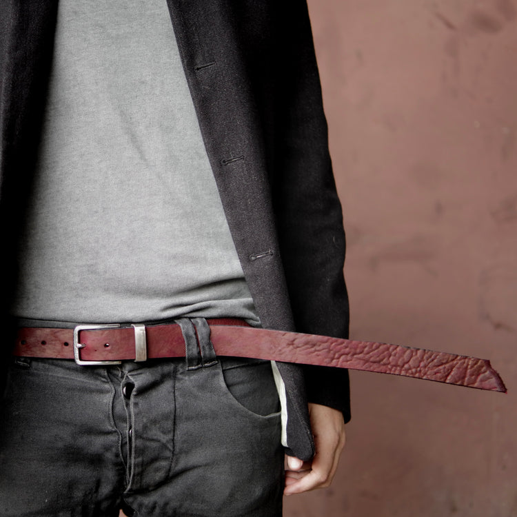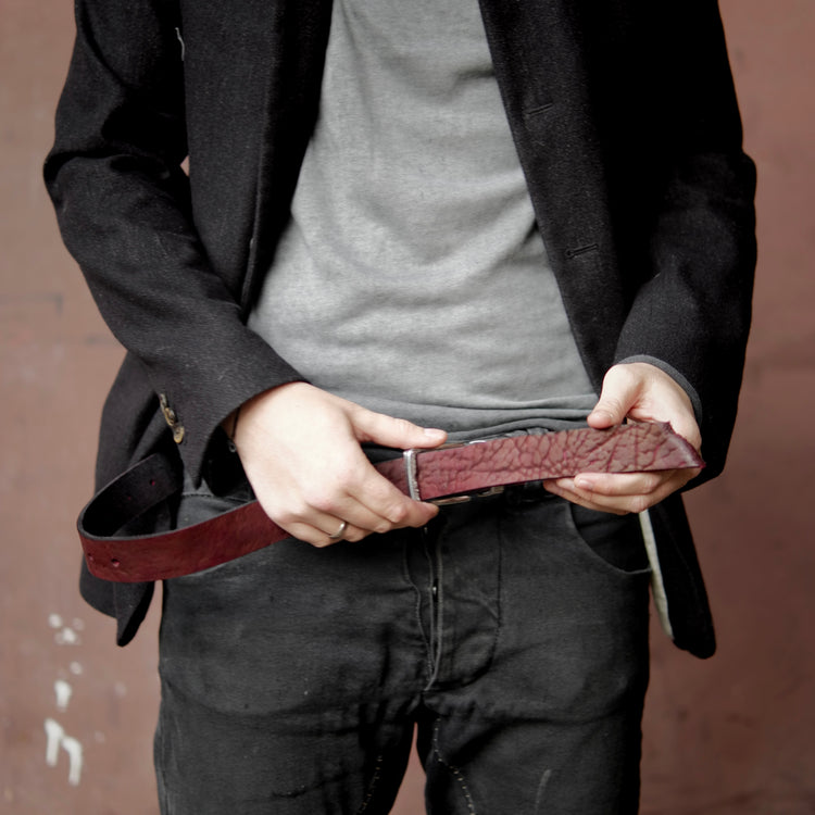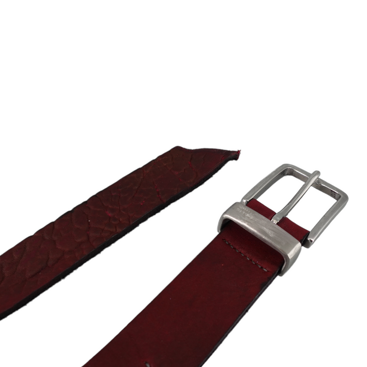 This beautiful belt with incredible structure is made from German buffalo. The leather is first split to desired thickness and then dyed by hand. The buckle as well as the loop are made from solid stainless steel which is then aged by hand.